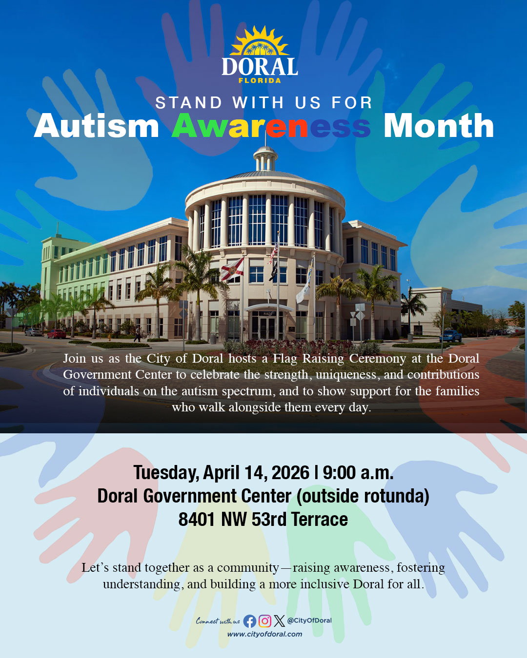 Join us as the City of Doral hosts a Flag Raising Ceremony at the Doral Government Center to celebrate the strength, uniqueness, and contributions of individuals on the autism spectrum, and to show support for the families who walk alongside them every day.