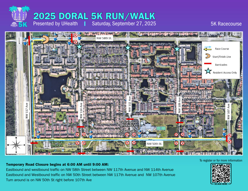 The Doral 5K, is a 3.1 mile Run/Walk through the heart of the City of Doral. Our Race Course begins at the entrance of Doral Meadow Park (11555 NW 58 Street).