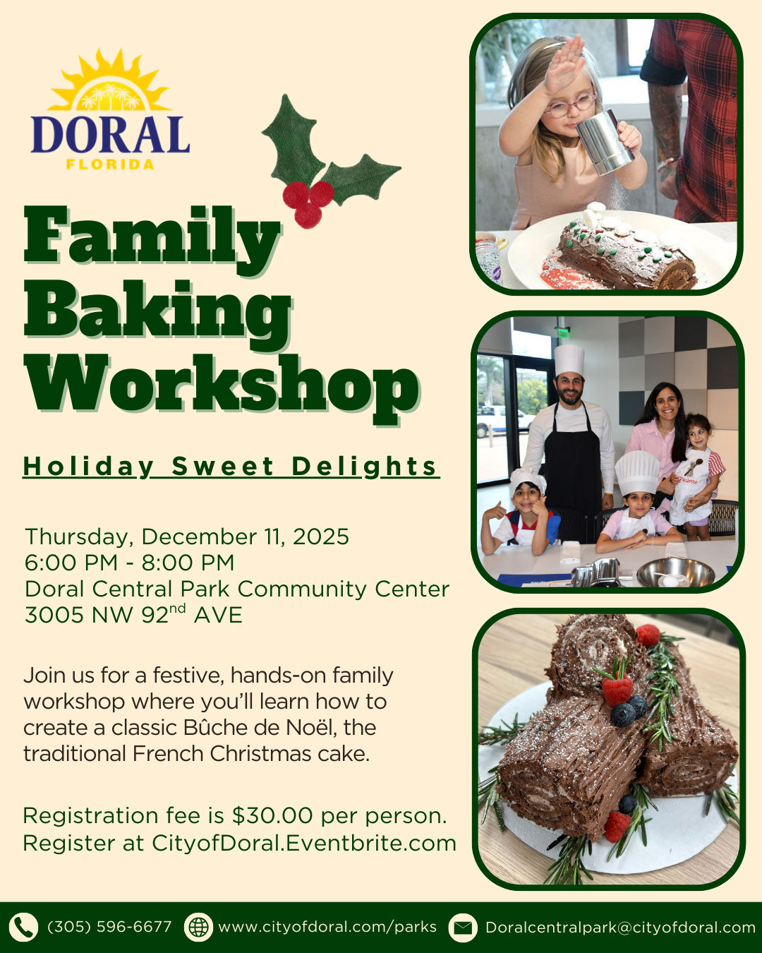 The Family Baking Workshop: Holiday Sweet Delights is a festive, hands-on culinary experience designed for families to come together and learn how to create a classic Bûche de Noël (Yule Log), a traditional French Christmas dessert. Participants will follow step-by-step instruction led by an instructor, decorate their own holiday cake, and enjoy a warm and joyful seasonal atmosphere at the Doral Central Park Community Center.