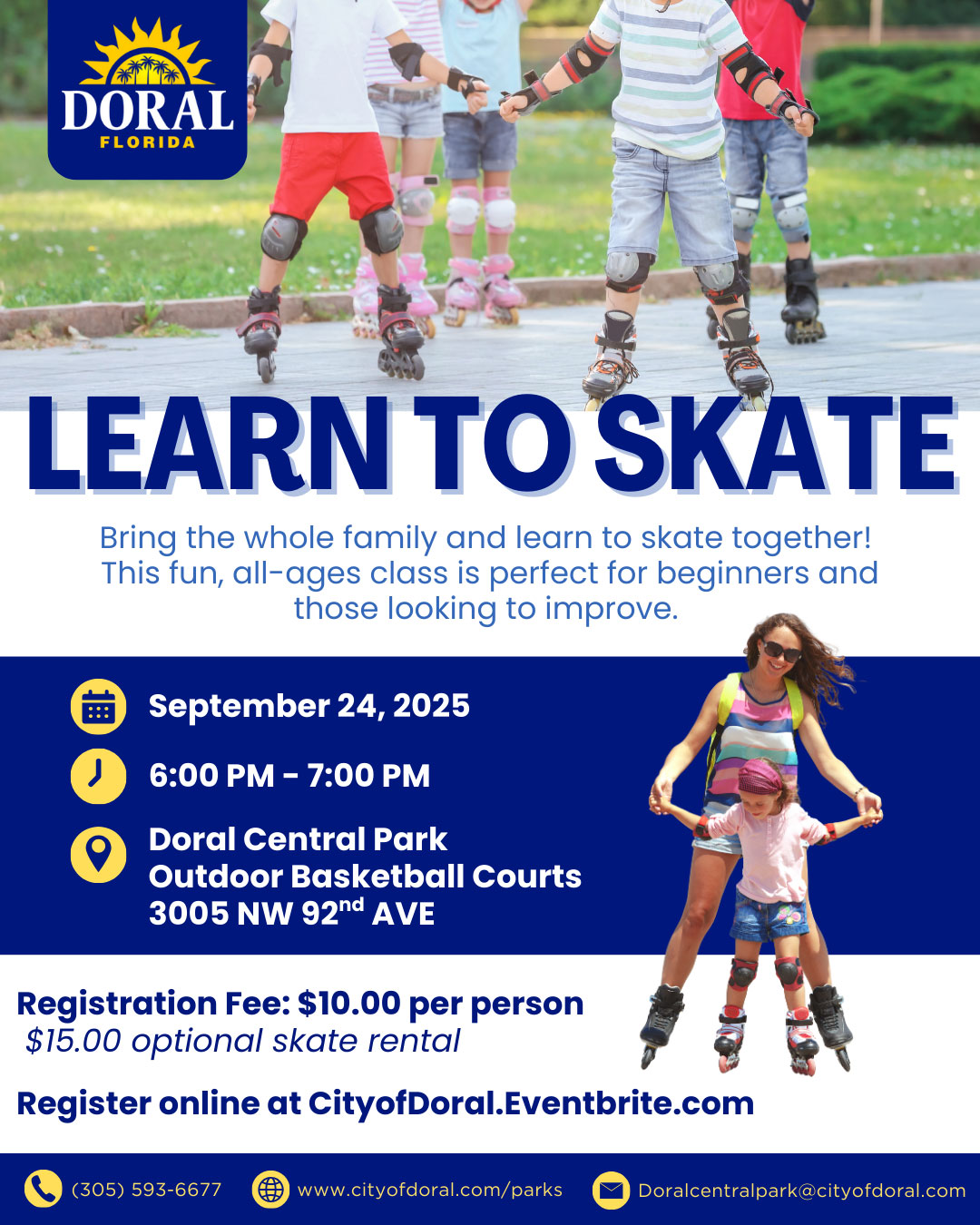 This event is $10 per participant, with an optional $15 skate rental. Limited space available — register online at CityofDoral.Eventbrite.com.