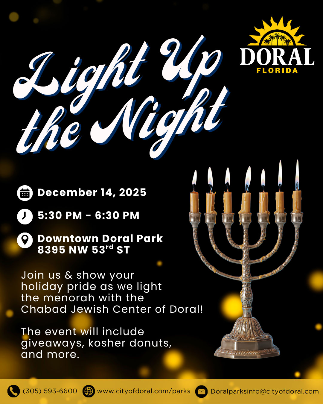 Join us and show your holiday pride as we light the menorah with the Chabad Jewish Center! The event will include giveaways, kosher donuts, and more.