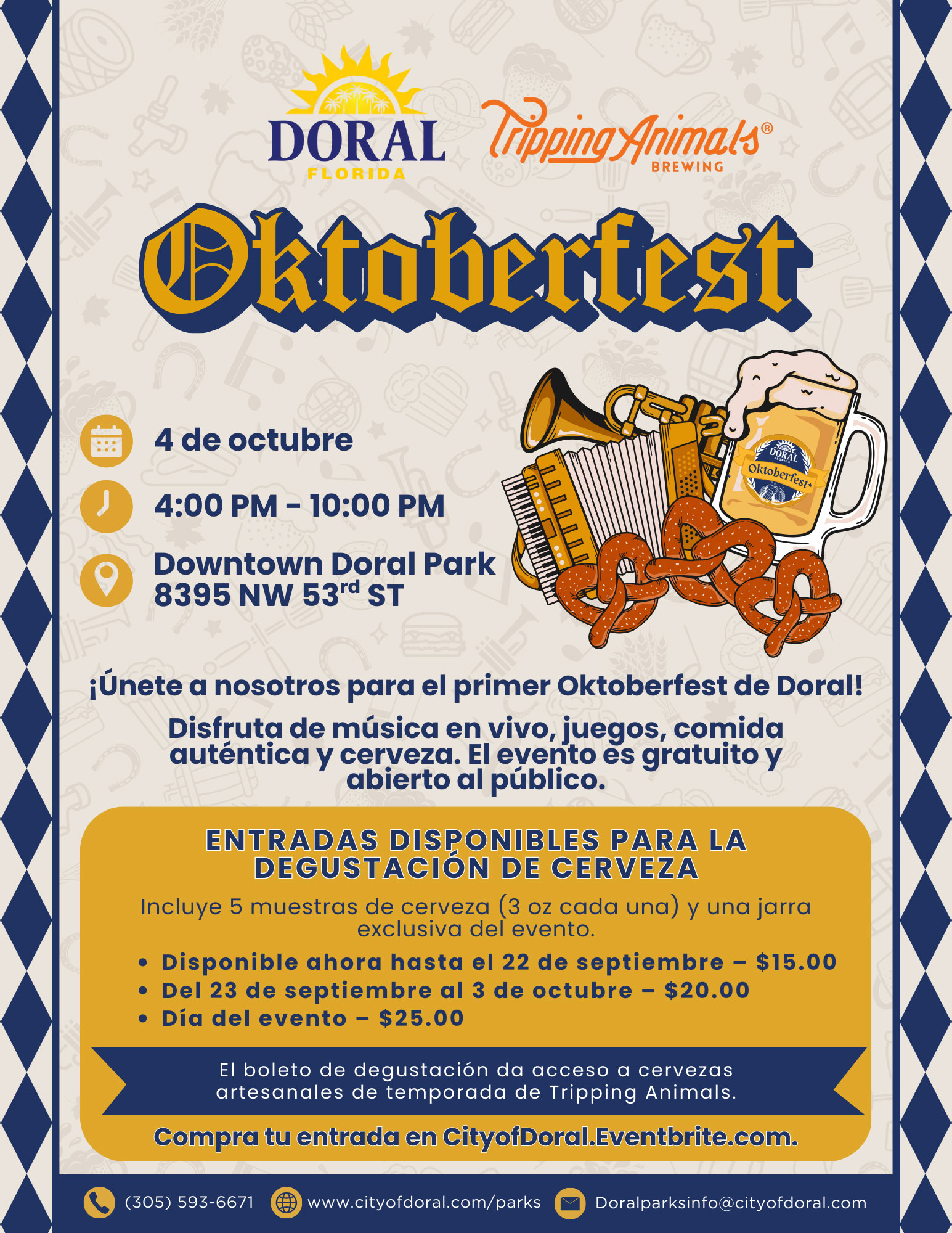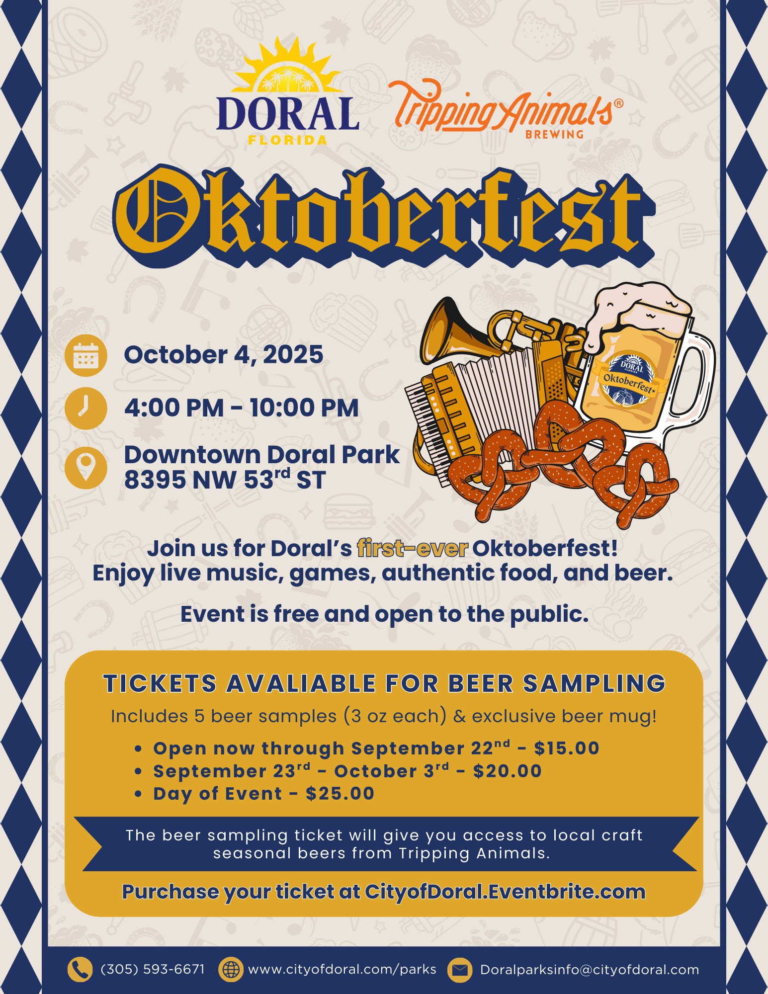 Join us as we bring the spirit of Oktoberfest to Doral! Enjoy an evening of traditional music, fun games, delicious food, and authentic beer sampling from local craft seasonal beers from Tripping Animals, all in a family-friendly atmosphere. Whether you’re here to sip, dance, play, or just soak in the festive vibes, there’s something for everyone.