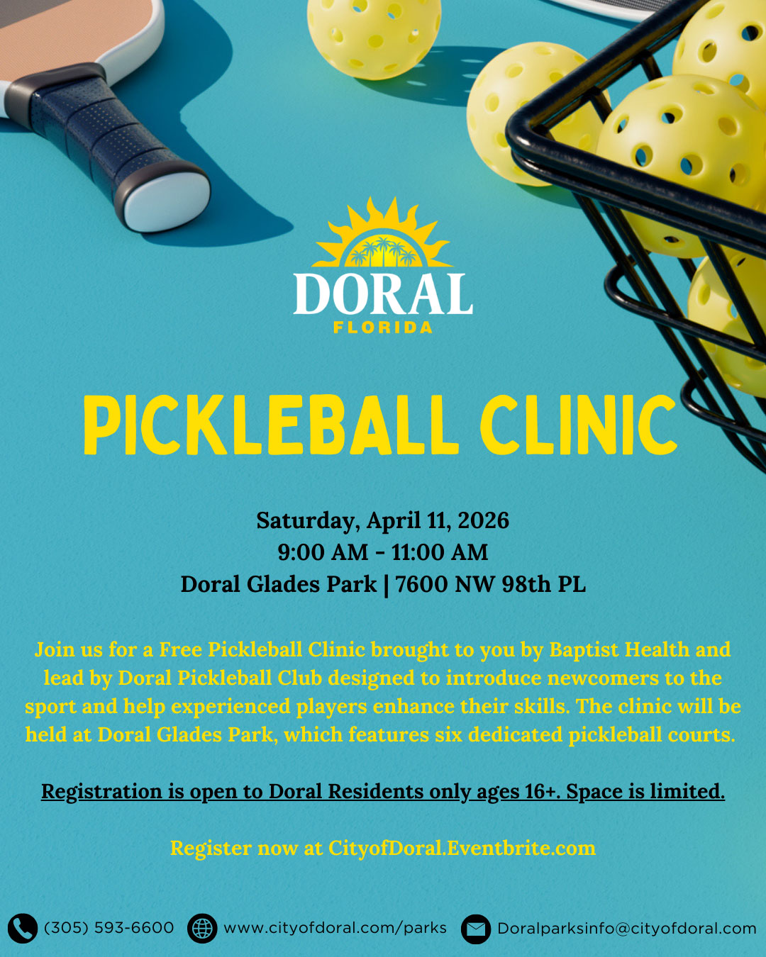 Join us for a Free Pickleball Clinic brought to you by Baptist Health and lead by Doral Pickleball Club.