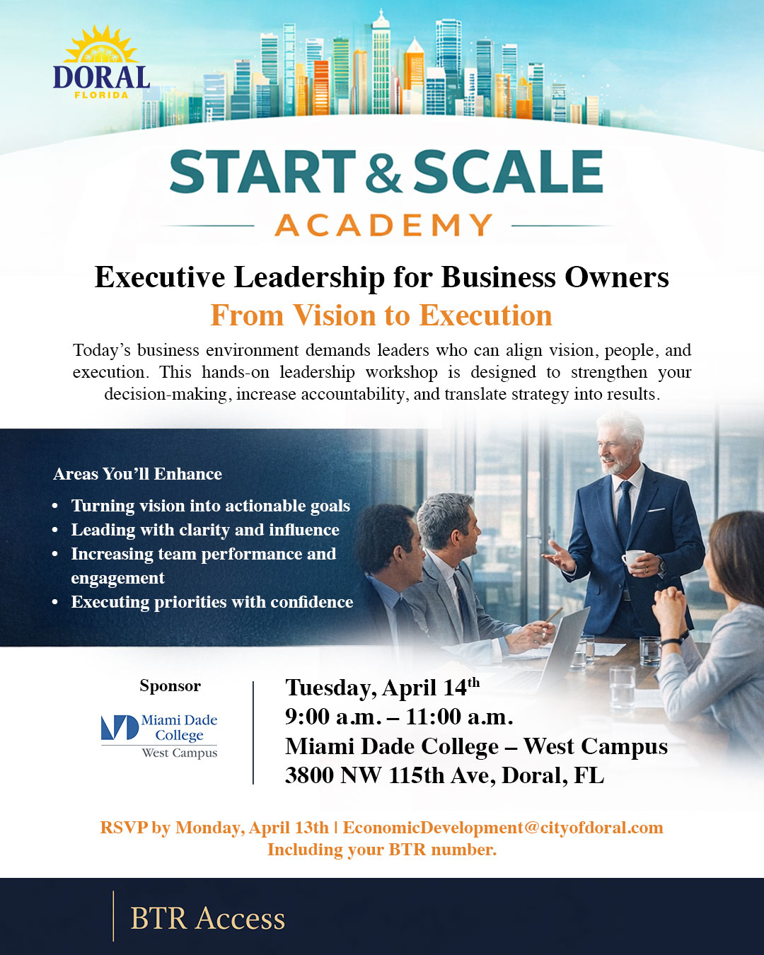 RSVP by Monday, April 13th | EconomicDevelopment@cityofdoral.com Including your BTR number.